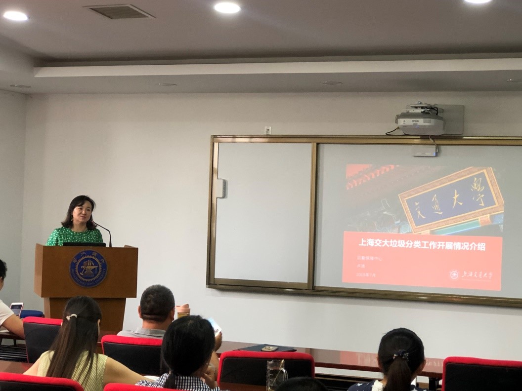 卢老师首先介绍了交大后勤保障中心的各部门职责。卢老师所在的物业与环境管理办公室主要负责校园内生活垃圾和绿化垃圾的处理。通过卢老师的介绍,党员们了解到校园中除了生活垃圾,还有实验垃圾、建筑垃圾、餐厨垃圾、绿化垃圾等不同种类的区别,在进行垃圾处理时,要求和方式也各不相同。针对生活垃圾的处理与分类,学校出台了《上海交通大学生活垃圾分类制度实施办法》等政策文件。也投入了大量的人力物力财力,建设绿色环保校园。