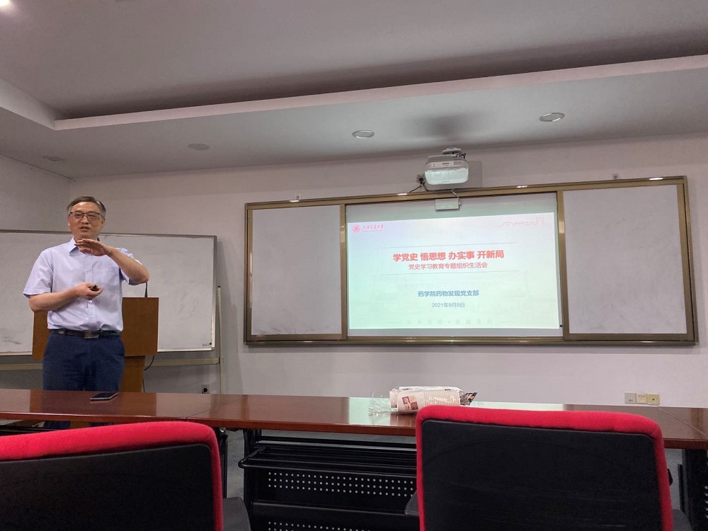 2021年9月9日中午,药物发现党支部在药学院5号楼312会议室开展“学党史、悟思想、开新局”党史学习教育专题组织生活会。会议由支部书记刘德龙同志主持,支部全体党员参加活动,院党委副书记叶定剑同志到会并讲话。