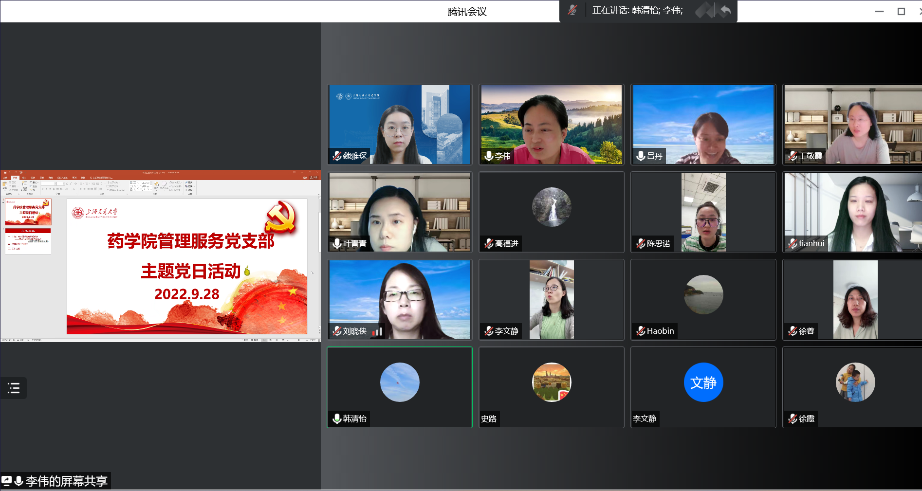 2022年9月28日下午,药学院管理服务党支部开展主题党日活动。院党委书记刘建新以普通党员身份参加了本次活动,活动由支部书记李伟主持。