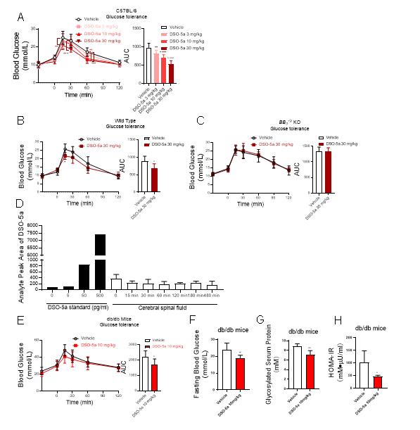 在前期BRS-3配体及功能的研究基础上(Cellular and Molecular Life Sciences 2022, 79, 72; Phytomedicine 2022, 100, 154085; Journal of Proteome Research 2020, 19, 1513-1521),上海交通大学药学院张岩课题组联合药学院李绍顺教授团队、生命科学技术学院肖华教授团队,发展了一系列含萘醌肟结构新型骨架的BRS-3选择性小分子激动剂,其中DSO-5a激动效果最强(IP-1测试中EC50≈3.8 nM),并可有效改善正常小鼠和糖尿病db/db小鼠的血糖稳态。药代动力学表明,DSO-5a穿过血脑屏障能力差,表明作用于外周BRS-3受体的小分子激动剂仍可以调节体内血糖稳态,并可能避免作用于中枢带来的副作用。进一步采用DSO-5a作为分子探针,通过定量蛋白质组学方法研究了BRS-3介导的信号通路,发现PPAR-gamma是一种由BRS-3介导的新型信号通路,对于调节体内葡萄糖稳态可能发挥着重要作用。该研究成果为II型糖尿病新型靶点的确认以及治疗提供了新策略。