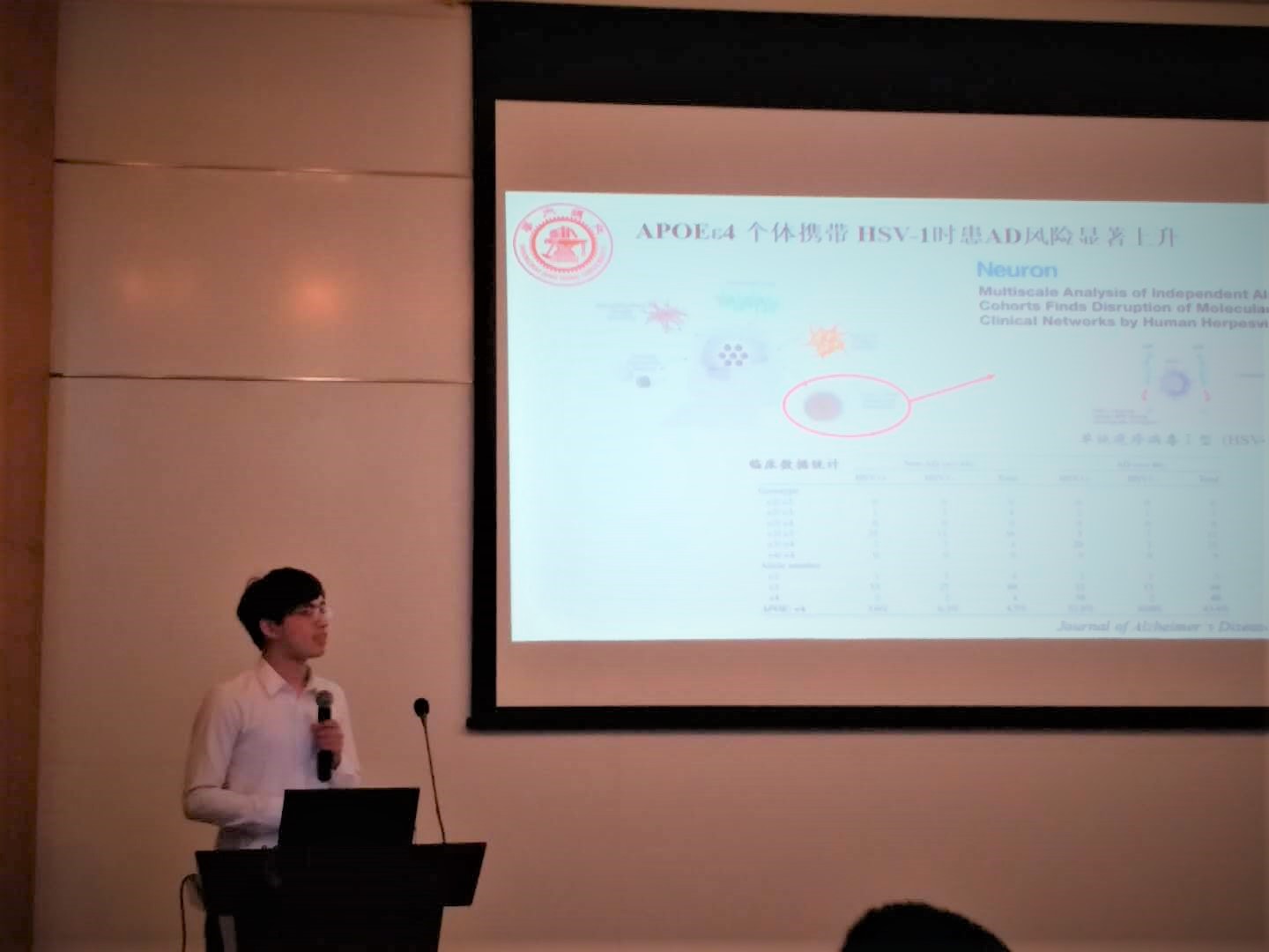 此次青年论文报告有来自上海交大药学院、交大医学院、复旦药学院、华东理工大学药学院、同济大学医学院、海军军医大学药学院等上海优秀高校和研究所的12位汇报人。经过4个多小时的学术报告,我院殷明老师课题组研究生高金超(导师:赵文娟)汇报的论文《载脂蛋白E4促进单纯疱疹病毒I型感染导致脑内Aβ沉积的神经免疫学机制》荣获优秀论文特等奖。阿尔茨海默病是高发于65 岁以上人群的神经退行性疾病,其病因和发病机制目前仍不清楚。APOE4是目前公认的散发性AD的高风险遗传因素。最近的研究发现,APOE4等位基因携带者是微生物感染导致AD发病的易感人群,包括HSV-1在内的微生物感染与APOE4等位基因两种因素的共同作用是散发性AD发病的主要原因。高金超等应用HSV-1分别经鼻感染不同基因型的APOE -TR小鼠,发现POE4促进HSV-1经鼻感染引起的脑组织内HSV-1扩增并导致脑内Aβ沉积,其机制与促进小胶质细胞分泌炎症因子及减弱CD1和NK T细胞参与的免疫应答异常有关,首次揭示载脂蛋白E4促进单纯疱疹病毒I型感染导致脑内Aβ沉积的神经免疫学机制。