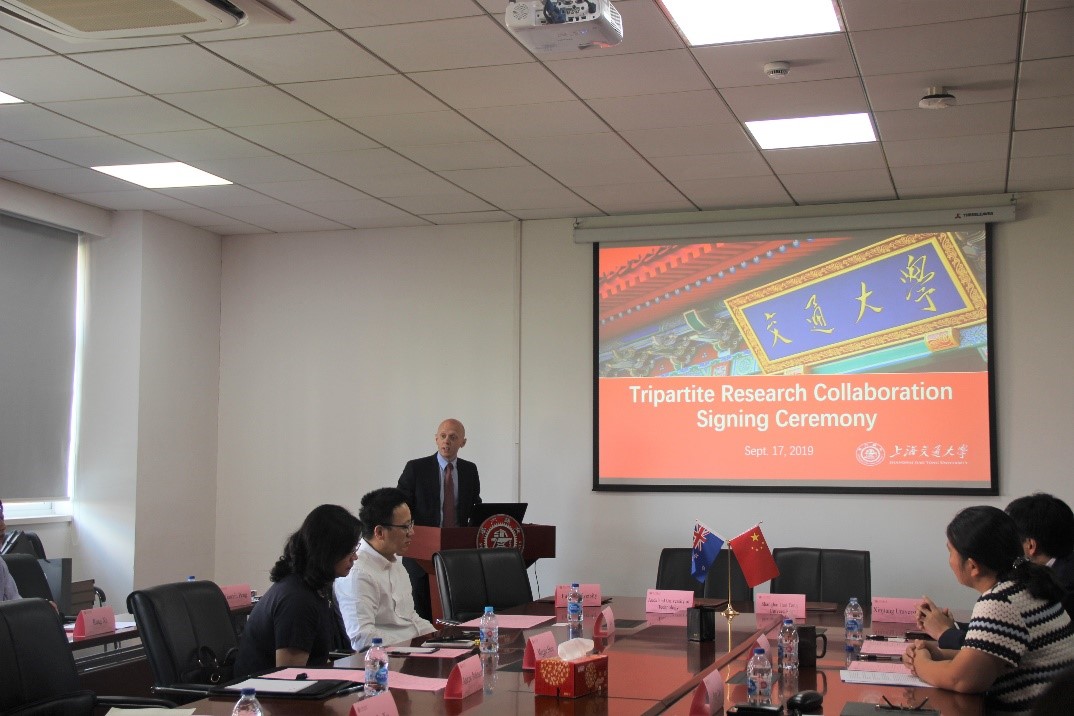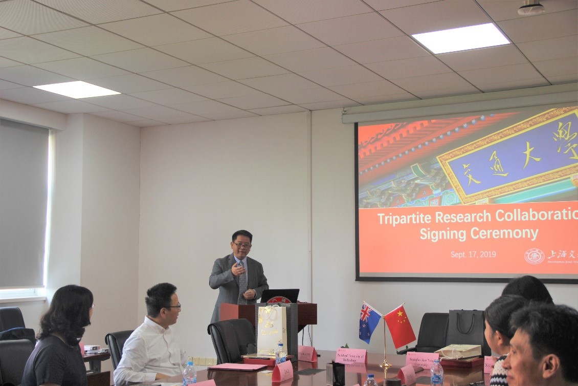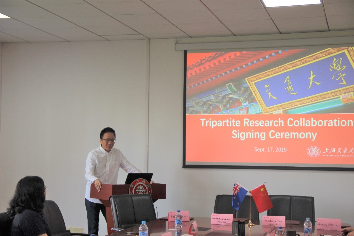 罗鹏代表上海交大向来宾表示了热烈欢迎。他表示,国际化是上海交大发展成世界一流大学的重要战略之一,希望以本次协议的签订为契机,提升和促进奥克兰理工大学与复旦大学、新疆大学和上海交通大学在科研方面的合作与交流。