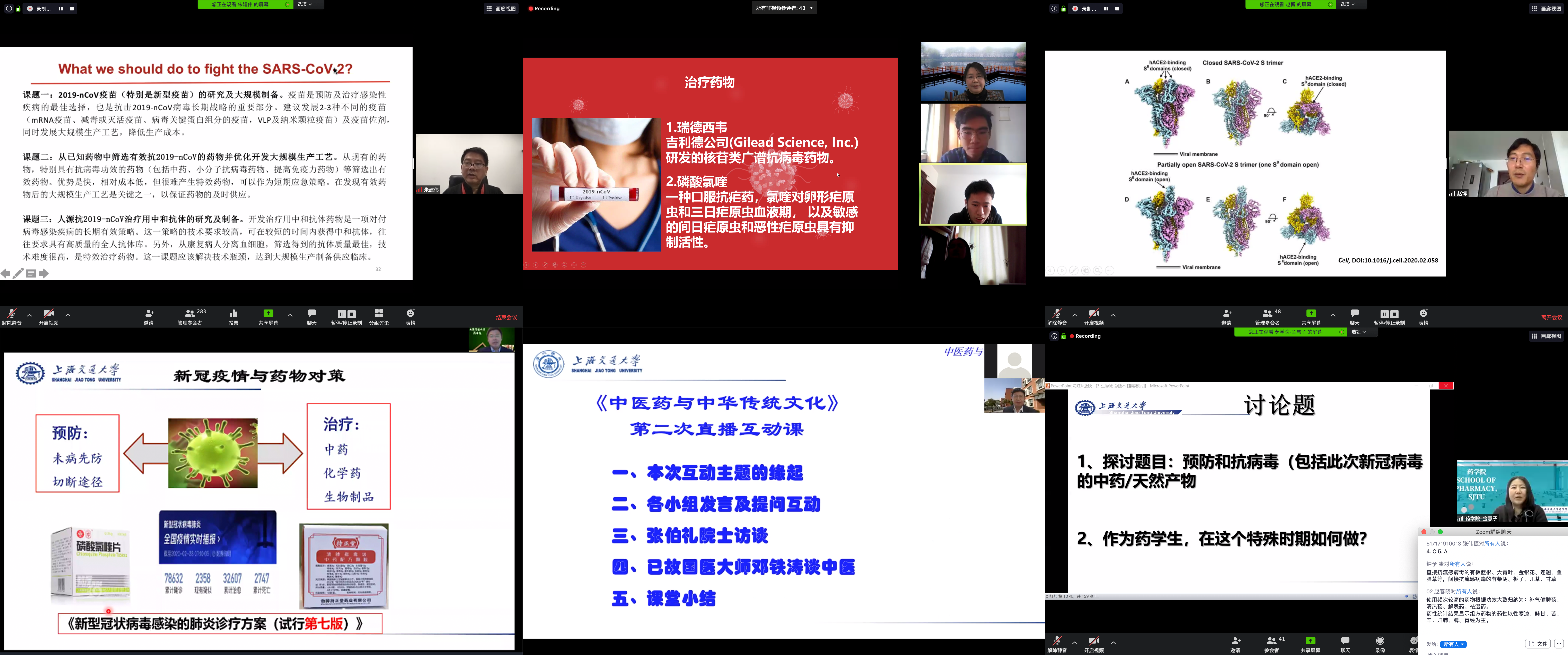 同样,以习主席在北京考察新冠肺炎防控科研攻关工作时强调的“协同推进新冠肺炎防控科研攻关,为打赢疫情防控狙击战提供科技支持”为契机,天然药物化学主讲教师金慧子带领同学们发起了以“预防和抗病毒的中药/天然产物”为主题的线上科学探讨。其中,黄晋、曾鑫成、吴紫薇等同学分享了能预防和抗病毒的中药品种,以及这些中药中含有较好抗病毒活性的鞣酸和生物碱等成分的知识。蒋斌诚等同学纷纷表示网络上还存在非常对针对中医药研究的误解,我们作为专业学生,要保持清醒的头脑,运用专业知识加以判断,在力所能及的氛围内为社会做贡献,体现作为药学生的价值和意义。金老师对于同学们所分享的内容表示肯定,她说:“新药研发时间漫长,应重点关注老药新用;中医药疗效显著,并有着几千年的临床应用,在此次疫情中也起到很大的作用。作为药学学生,应该主动了解药物研发现状、疫情的进展,运用好自己的专业知识,在未来科学地发扬民族瑰宝中医药,为人类健康事业做出贡献。”