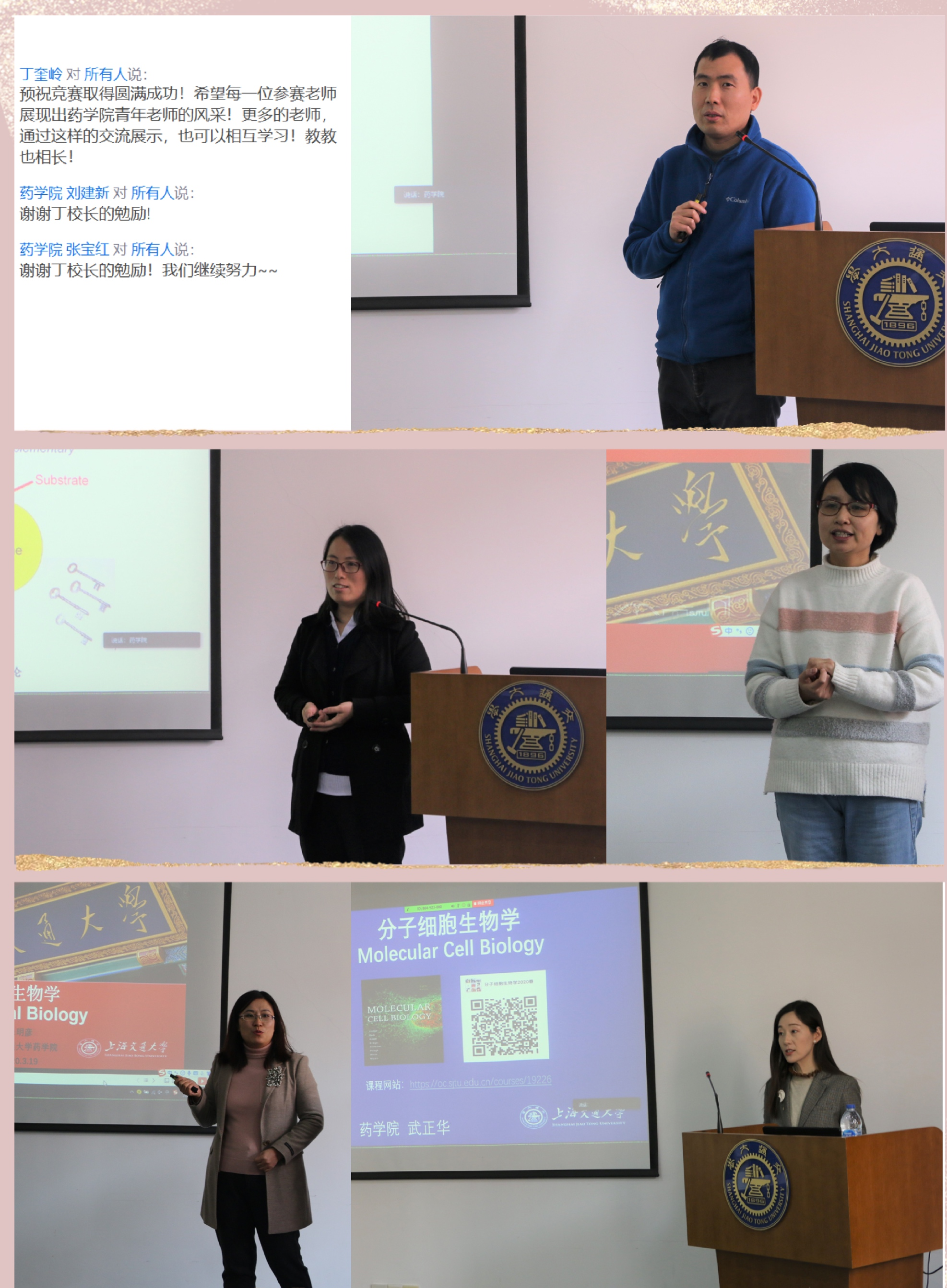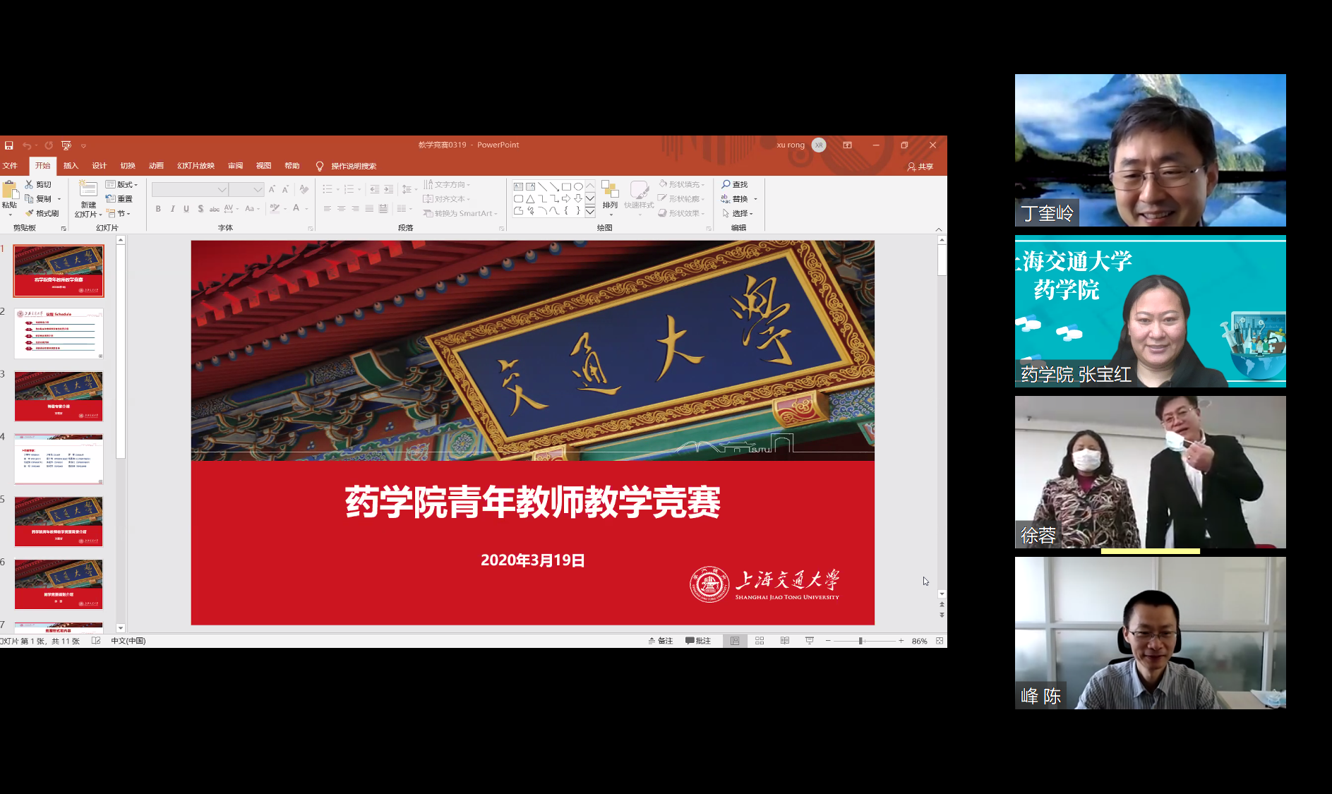 3月19日下午,药学院首届青年教师教学竞赛在药学院5-316室举行。在“新冠肺炎”疫情特殊时期,本次比赛特邀上海交通大学常务副校长丁奎岭,工会主席于朝阳、副主席罗莹,教务处副处长陈锋,教学发展中心副主任梁竹梅,化工学院教学副院长钱雪峰,药学院党委书记刘建新、院长朱建伟、教学副院长张宝红,以及教授殷明、陈代杰,副教授魏晓慧分别以在线或现场的方式担任特邀专家评委。来自药学院不同学科方向的5位青年教师孟青青、朱明彦、孙占奎、赵亚雪和武正华参加了本次竞赛。