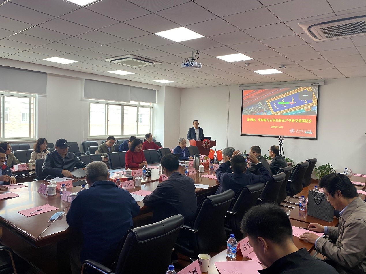 10月22日上午,药学院、生命科学技术学院与石家庄代表团产学研交流座谈会在药学院举行。石家庄市委组织部四级调研员田镜湘率领人才二处处长韩伟、市科技局三级调研员闫志民、市投促局副局长杨会印等党政领导,以及华北制药集团有限责任公司、石药控股集团有限公司、石家庄四药有限公司等九家大型药企高管出席座谈会。药学院党委书记刘建新、副院长邱明丰、讲席教授朱建伟、特聘教授陈代杰、长聘教授郭圣荣和马步勇、研究员丁春勇、生命科学技术学院张晨虹研究员等十余位教师代表参会。会议由副院长邱明丰主持。