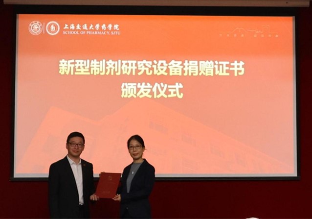 LOGAN公司向上海交通大学药学院捐赠的新型制剂研究设备,目前放置在药学院精准药物递送与药用材料实验室。为感谢LOGAN公司助力我校师生的科学研究发展,于洋代表学校向LOGAN公司授予捐赠证书。