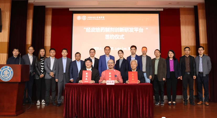 在与会嘉宾的见证下,郭圣荣、Luke Lee与梁秉文共同签署“上海交通大学药学院-LOGAN-世中联经皮给药创新研发平台协议”,孙占奎、陆伟跃、梁秉文、魏海飞、焦云洞共同为研发平台揭牌,宣布三方合作共建的“经皮给药创新研发平台”正式成立。