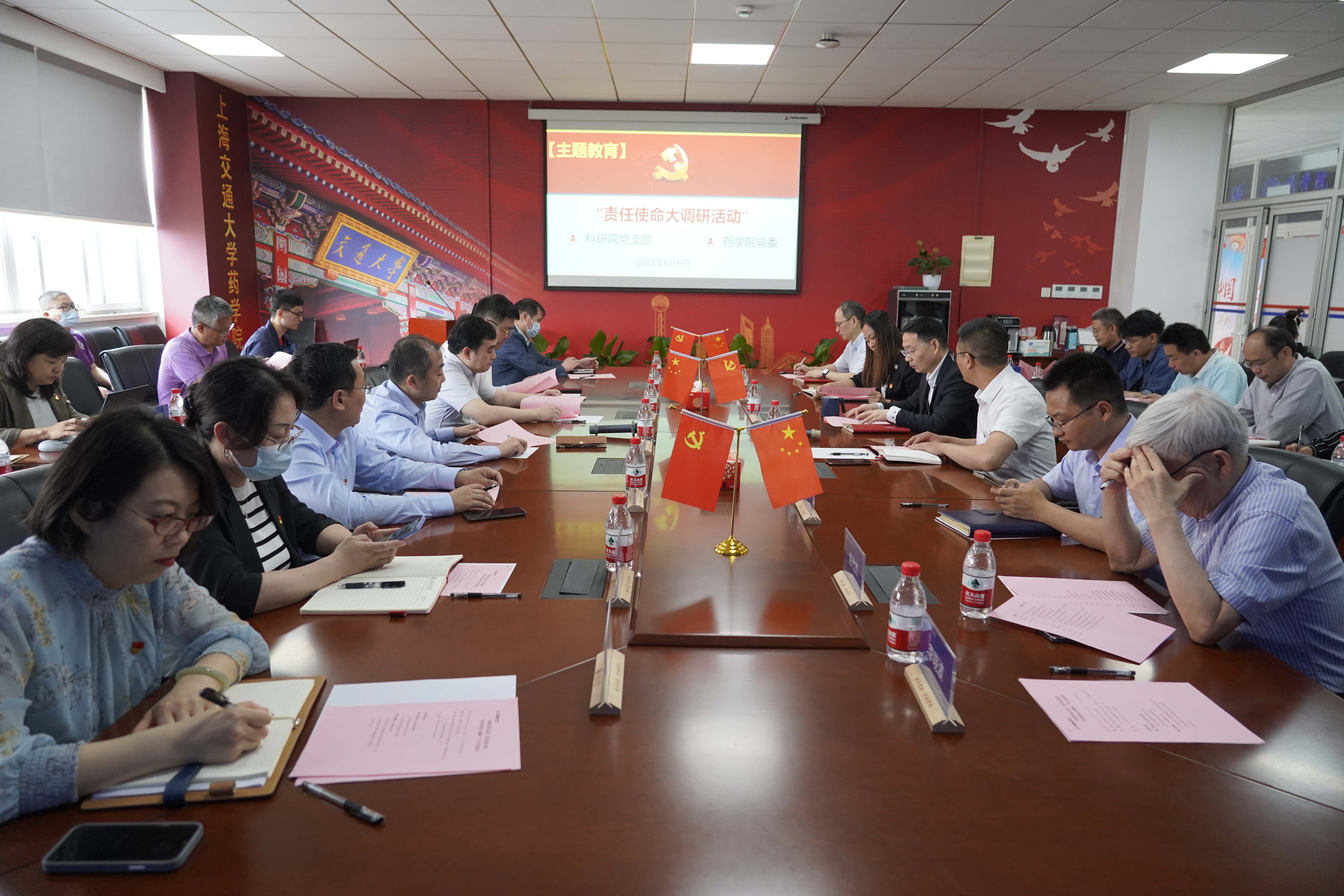 为进一步推动主题教育走深走实,增强调查研究工作针对性实效性,6月6日下午,药学院党委与科研院党支部在药学院5-412会议室联合举办“责任使命大调研”学习交流会。校科学技术发展研究院党支部书记、院长曾小勤,先进技术与装备研究院院长邹卫文,前沿技术研究院院长赵一新,学术发展与成果处处长陆琪,党支部副书记、先进技术与装备研究院副院长史文博,先进产业技术研究院副院长许文平,科研院各办公室主要负责同志,药学院党委书记彭树涛,院长张翱等全体党政班子成员,药学院骨干教师代表及内设机构人员参会。会议由彭树涛主持。