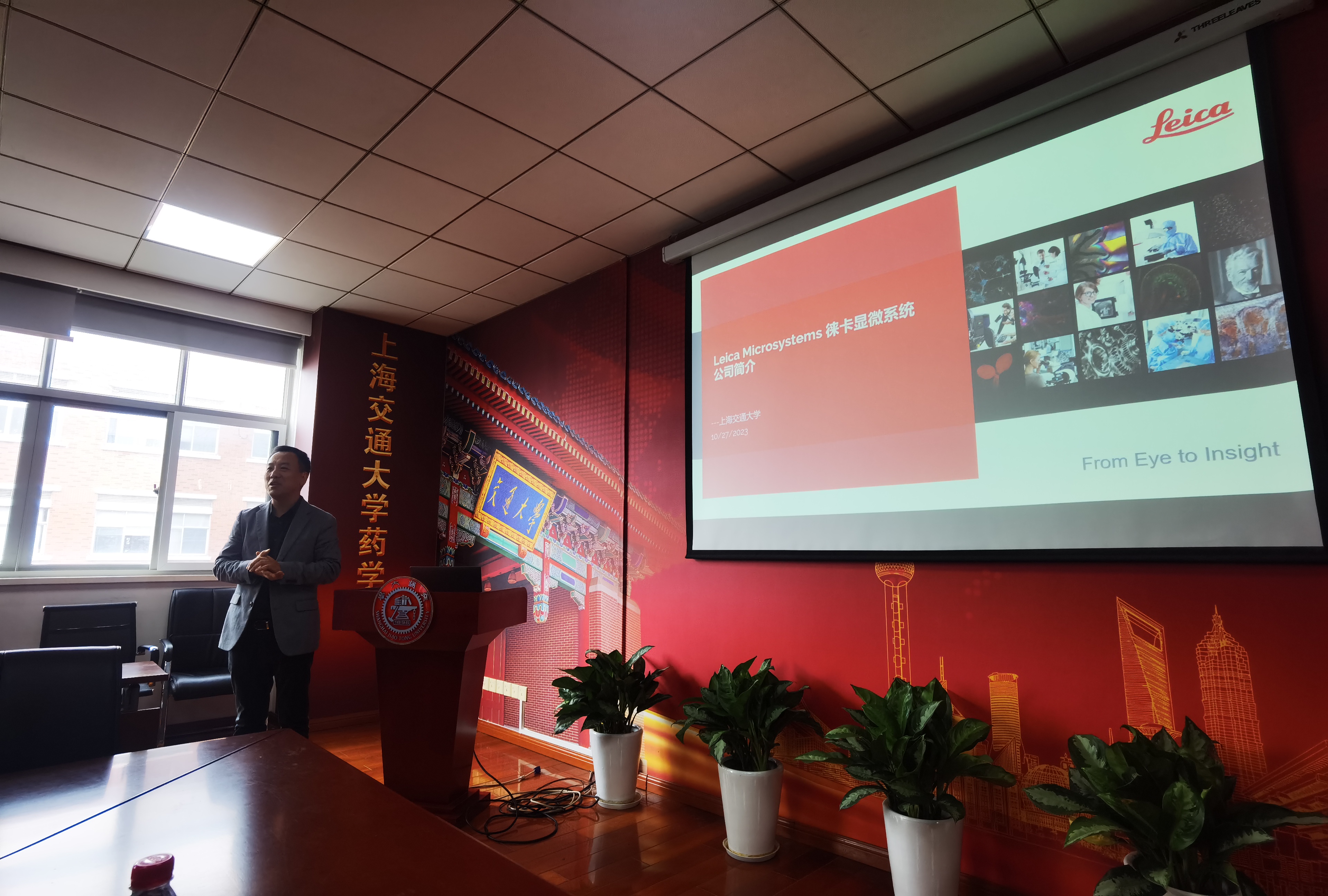 10月27日下午,徕卡显微系统公司(上海)贸易有限公司徕卡大中华区总经理章越,华东区销售总监李亚东,客户主管孙伟,上海昊扩科学器材有限公司高校科研销售总监张平一行四人到访上海交通大学药学院。上海交通大学药学院党委副书记叶定剑,副院长钱峰,长聘教轨副教授沈玉道、薛向东及学院内设机构负责人参会。会议由叶定剑主持。