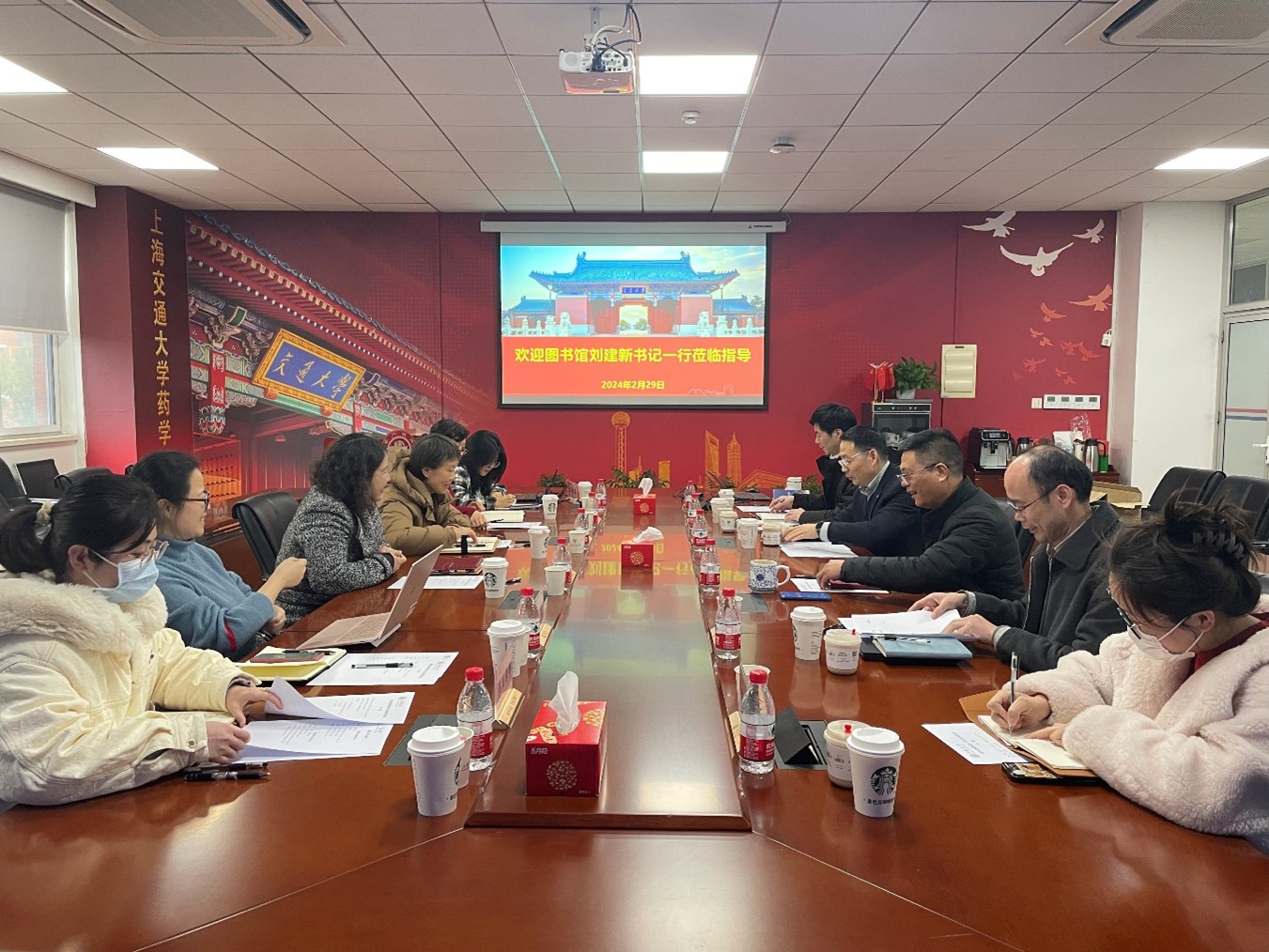 2月29日下午,上海交通大学图书馆党委书记刘建新、副馆长潘卫,研究支持中心老师等一行到访药学院,调研交流药学院人才建设情况,学院党委书记彭树涛、院长张翱、院长助理邓刘福等出席。