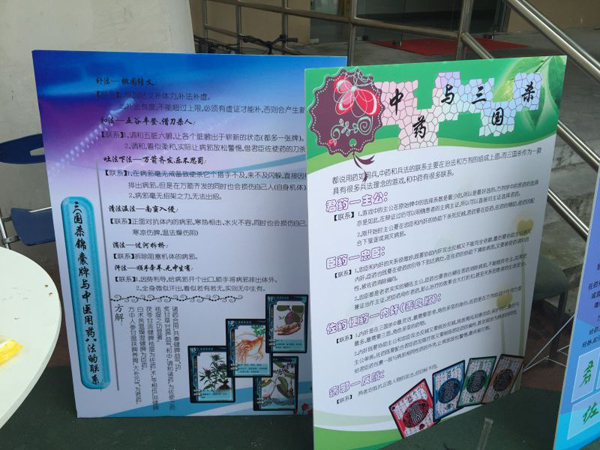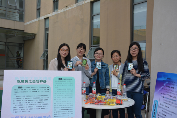 我们药学院的志愿者们带来了精心准备的“你所不知道的甄嬛传”,“中药与三国杀”等活动。“你所不知道的甄嬛传”是选取甄嬛传中涉及的中药知识,给大家进行讲解和辟谣。现在还准备了甄嬛传涉及的中药知识竞猜,回答正确的同学获得各式各样的养生花茶。“中药与三国杀”则是将中医药里的“君药”、“臣药”、“佐药”和“使药”和三国杀的角色相联系,在游戏中了解各个品种的中药材和中医药的一些基本理念。这些游戏寓教于乐,增加同学们对中医药文化的兴趣,在游戏中普及中医药知识。