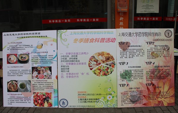 进入冬季以来,气温骤降,天寒地冻,很多人往往只注重了外在的保暖防寒,却忽视了通过膳食保养的重要性,而冬季正是通过食疗调养身体增强体质的好“食”机。为了让更多的人了解和注重冬季膳食养生,上海交通大学药学院科学商店的志愿者们将所学的医药养生知识学以致用,于12月15日14:00在科学商店一条街举办了此次冬季膳食科普活动,向附近的市民朋友义务宣传冬季膳食健康知识,获得了广大市民的一致好评。